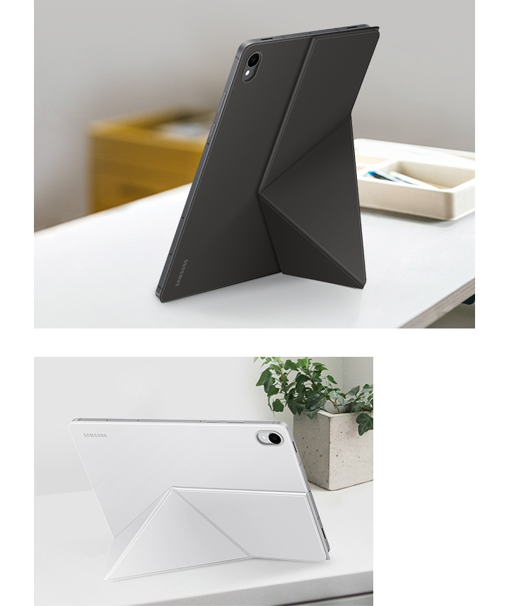 하나의 북커버로 갤럭시 탭을 세로 또는 가로 모드로 사용할 수 있습니다.