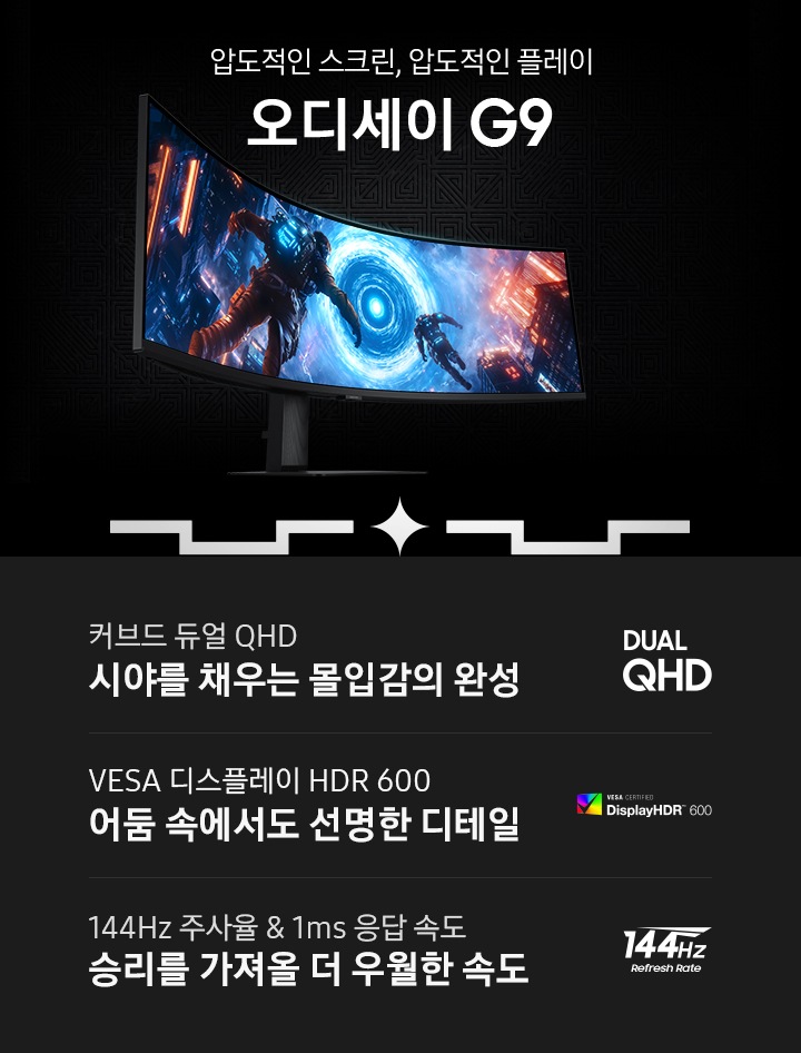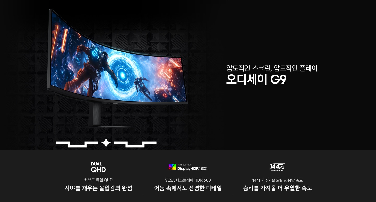 왼쪽에는 오디세이 G9 모니터가 측면을 향하여 보여지고 있습니다. 오른쪽에는 압도적 스크린, 압도적 플레이 오디세이 3D 텍스트가 보입니다. 하단에는 3가지 특징의 아이콘과 텍스트가 보입니다. 커브드 듀얼 QHD 시야를 채우는 몰입감의 완성 VESA 디스플레이 HDR 600 어둠 속에서도 선명한 디테일 144Hz 주사율 & 1ms 응답 속도 왼쪽에는 오디세이 G9 모니터가 측면을 향하여 보여지고 있습니다. 오른쪽에는 압도적 스크린, 압도적 플레이 오디세이 3D 텍스트가 보입니다. 하단에는 3가지 특징의 아이콘과 텍스트가 보입니다. 커브드 듀얼 QHD 시야를 채우는 몰입감의 완성 VESA 디스플레이 HDR 600 어둠 속에서도 선명한 디테일 144Hz 주사율 & 1ms 응답 속도