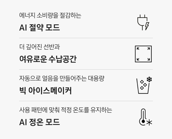 냉장고 스스로 사용량을 예측하고 조절하여 에너지 소비량을 절감할 수 있습니다.