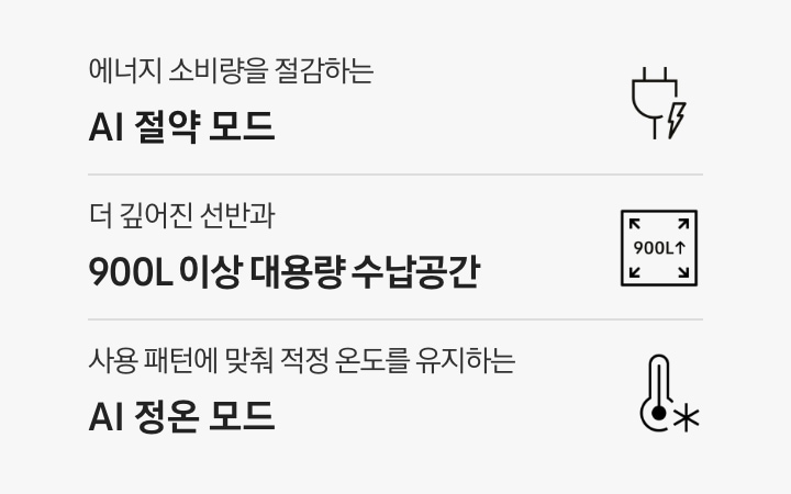 공간 효율을 높인 설계로, 선반은 60mm 더 깊어지고 내부 공간도 900L 이상으로 더 넓어졌습니다.