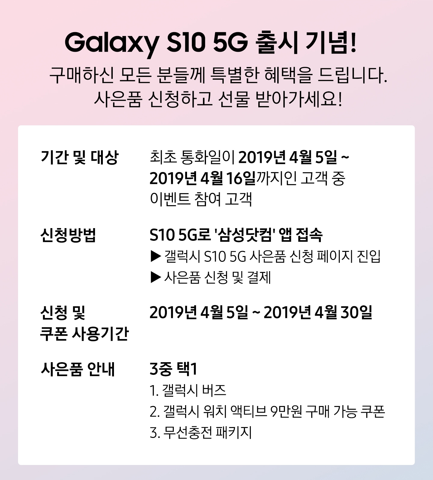 S10 5G 사은품은 단말에 유심을 꽂고 최초통화 이력을 발생 시킨 후 신청하셔야 합니다. | |