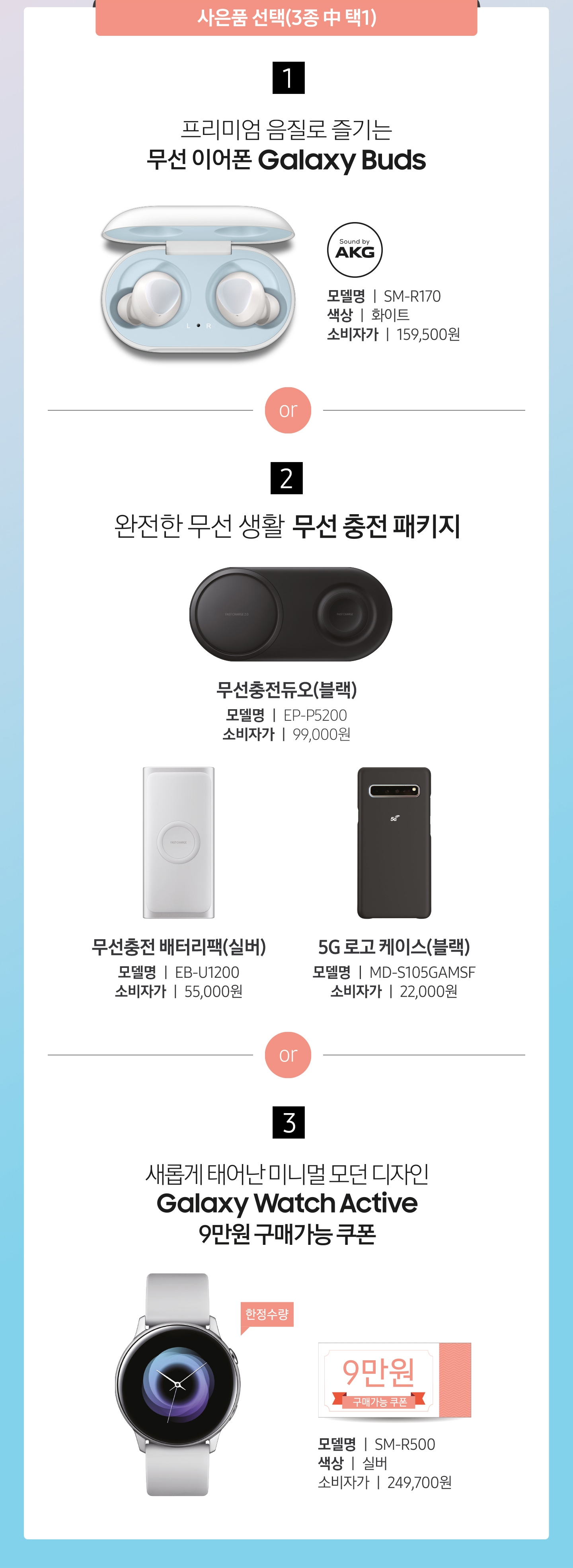 - 3중 택1, 1. 갤럭시 버즈 2. 갤럭시 워치 액티브 9만원 구매 가능 쿠폰 3. 무선충전 패키지