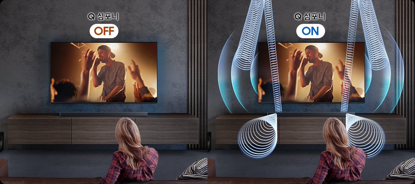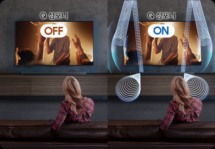 Q 심포니는 음성과 배경음을 분리하고 최적의 채널로 재생해, TV 스피커와 사운드바의 완벽한 시너지를 만들어 냅니다.