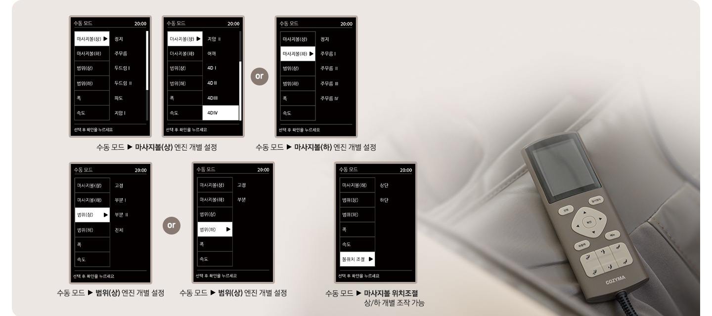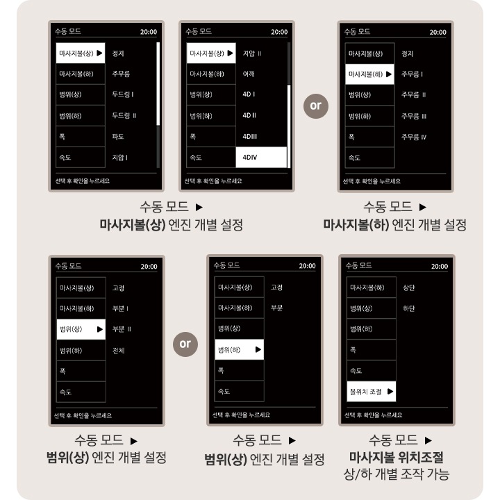 수동모드에서 안마모드 및 범위를 개별 설정할 수 있습니다.