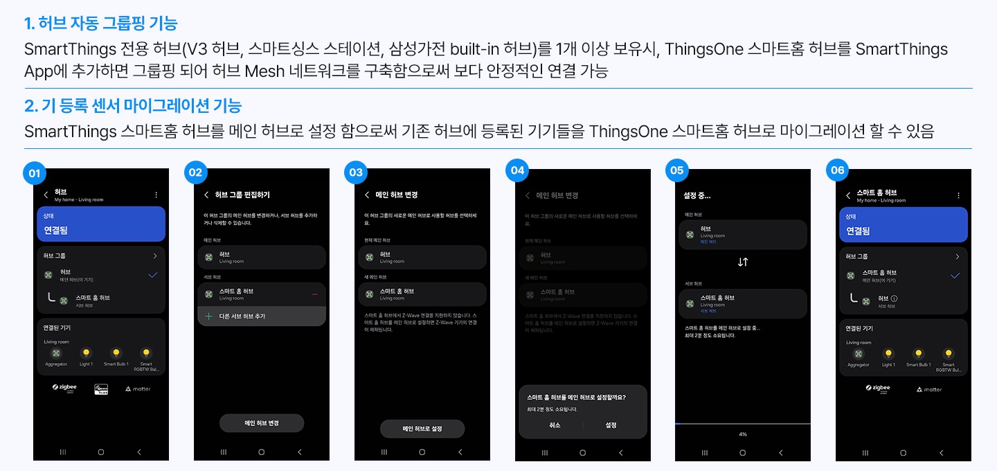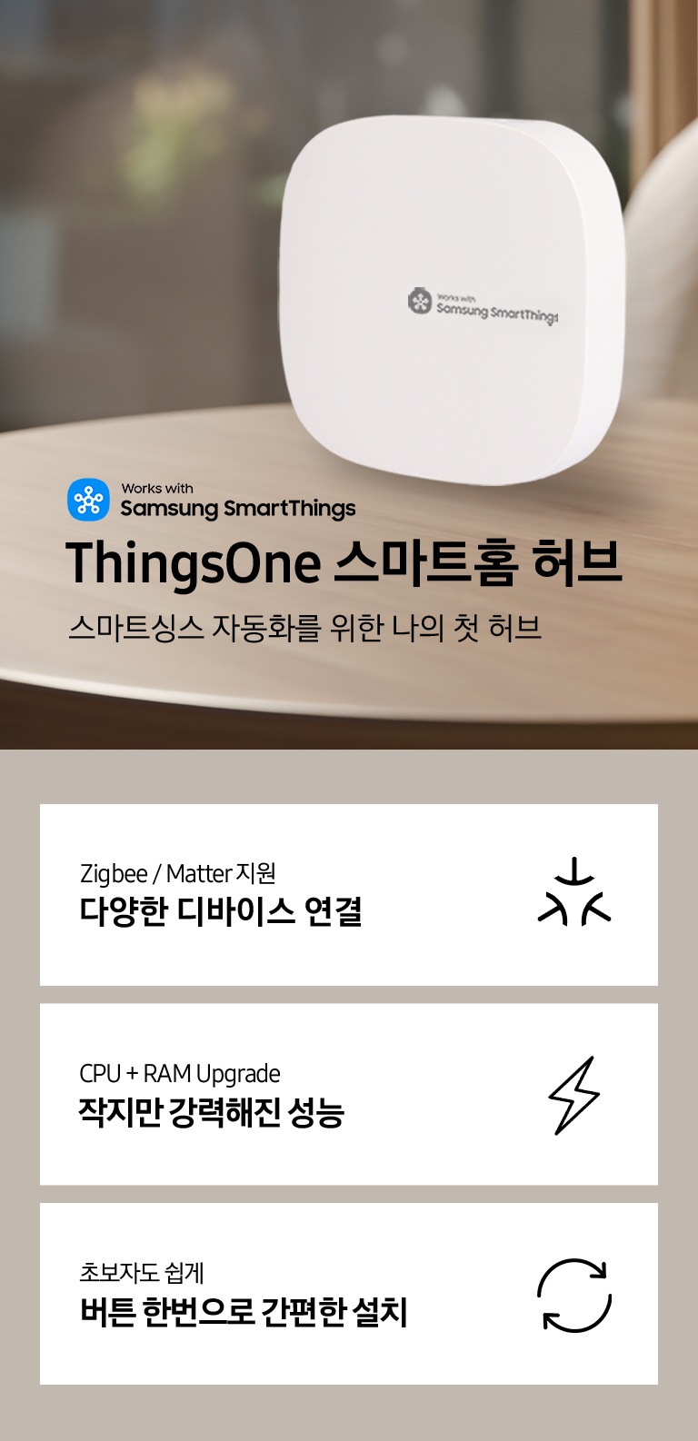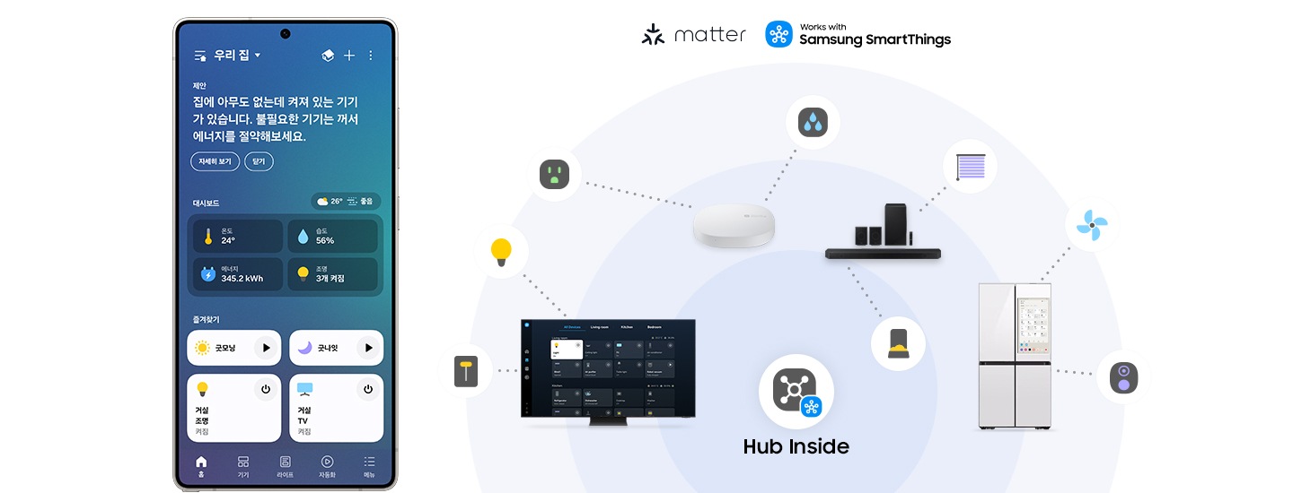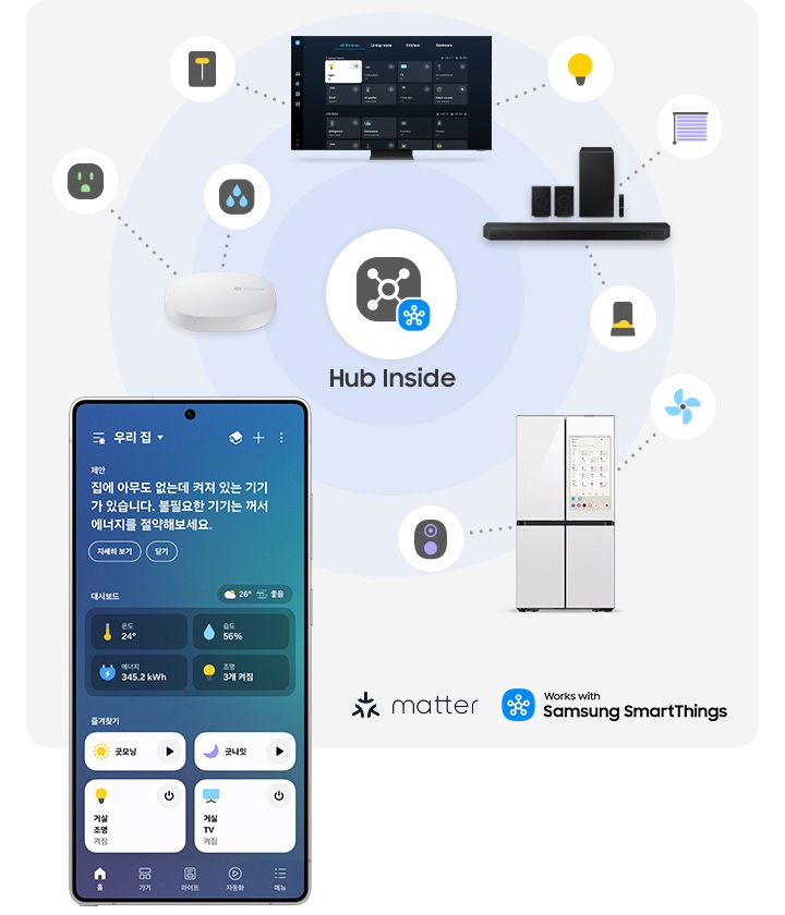 * 스마트싱스 허브는 Matter(Thread/Wi-Fi) 및 WWST 인증된 Zigbee 통신 방식의 스마트홈 기기 연결을 지원합니다.