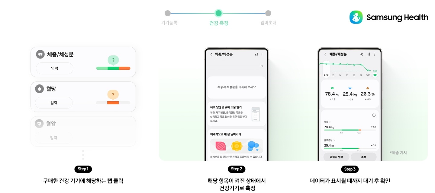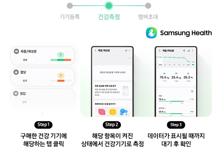 * 체중계 올라가기 전, 삼성 헬스 체중/체성분 탭을 먼저 켜주세요.