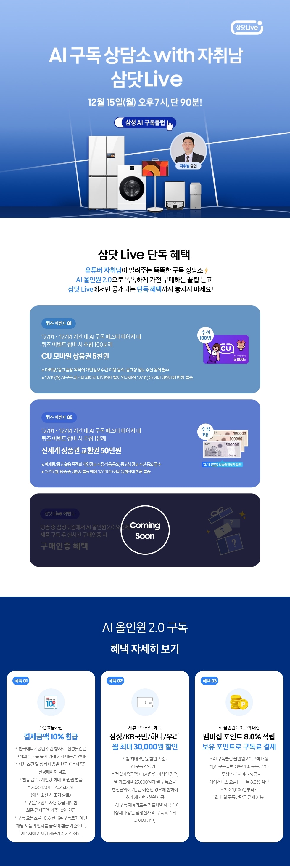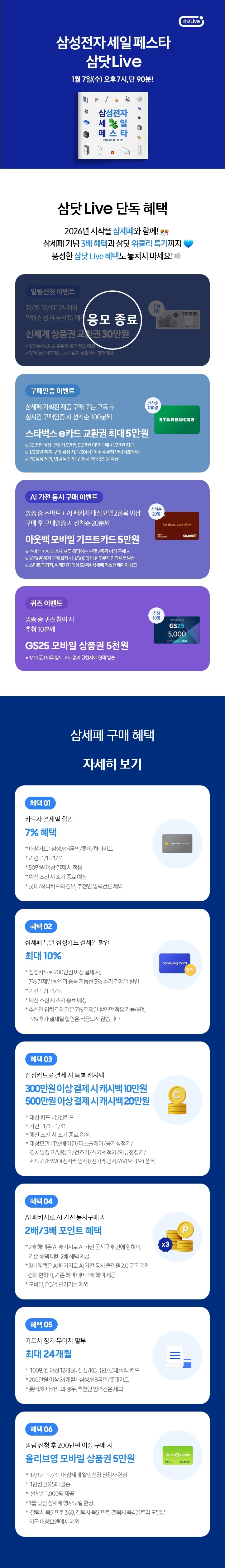 - 본 이벤트는 삼닷 Live 내 대상 모델에 한하여 적용되며, 사전 예고 없이 변경 또는 중단될 수 있습니다.
