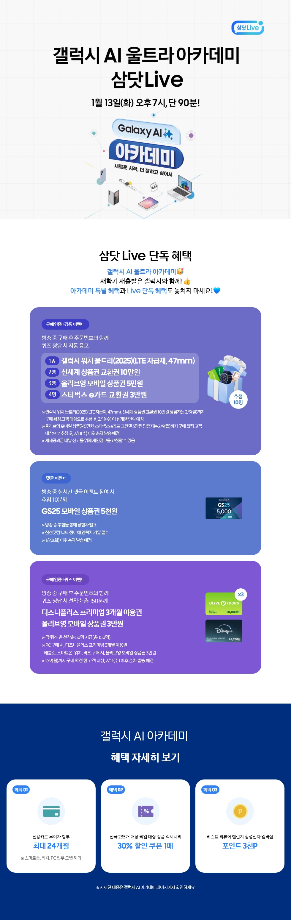 - 해당 이벤트는 삼성닷컴 또는 갤럭시 캠퍼스에서 2026년 1월 13일 19시 ~ 20시 30분 갤럭시 AI 울트라 아카데미 삼닷 Live 방송 중 구매한 후 구매인증 및 퀴즈 이벤트 당첨 조건을 충족한 주문 건에 한해 자동으로 응모되며 랜덤 추첨을 통해 혜택이 지급됩니다.