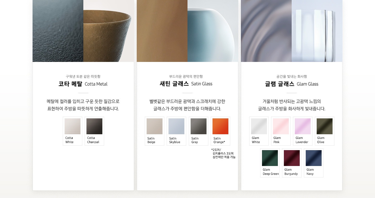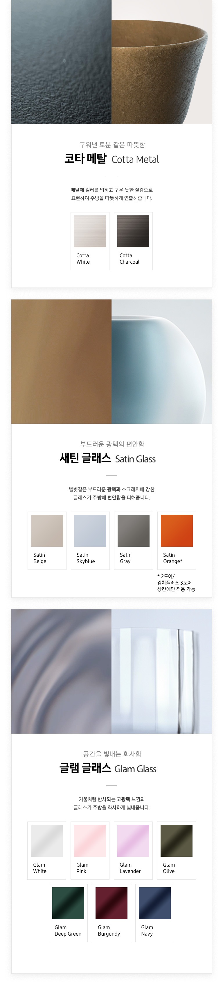 당신의 취향에 맞게 도어의 컬러와 소재를 마음대로 선택해 보세요.