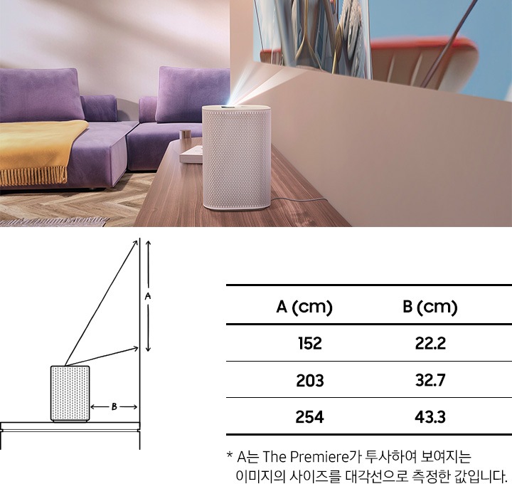 * 254cm 화면 구현을 위해서는 최소 42.3cm 이상의 투사거리가 필요합니다.