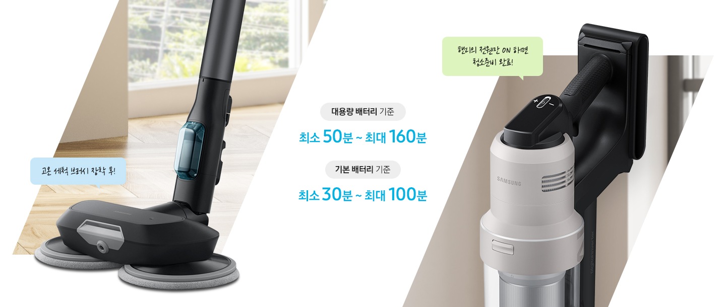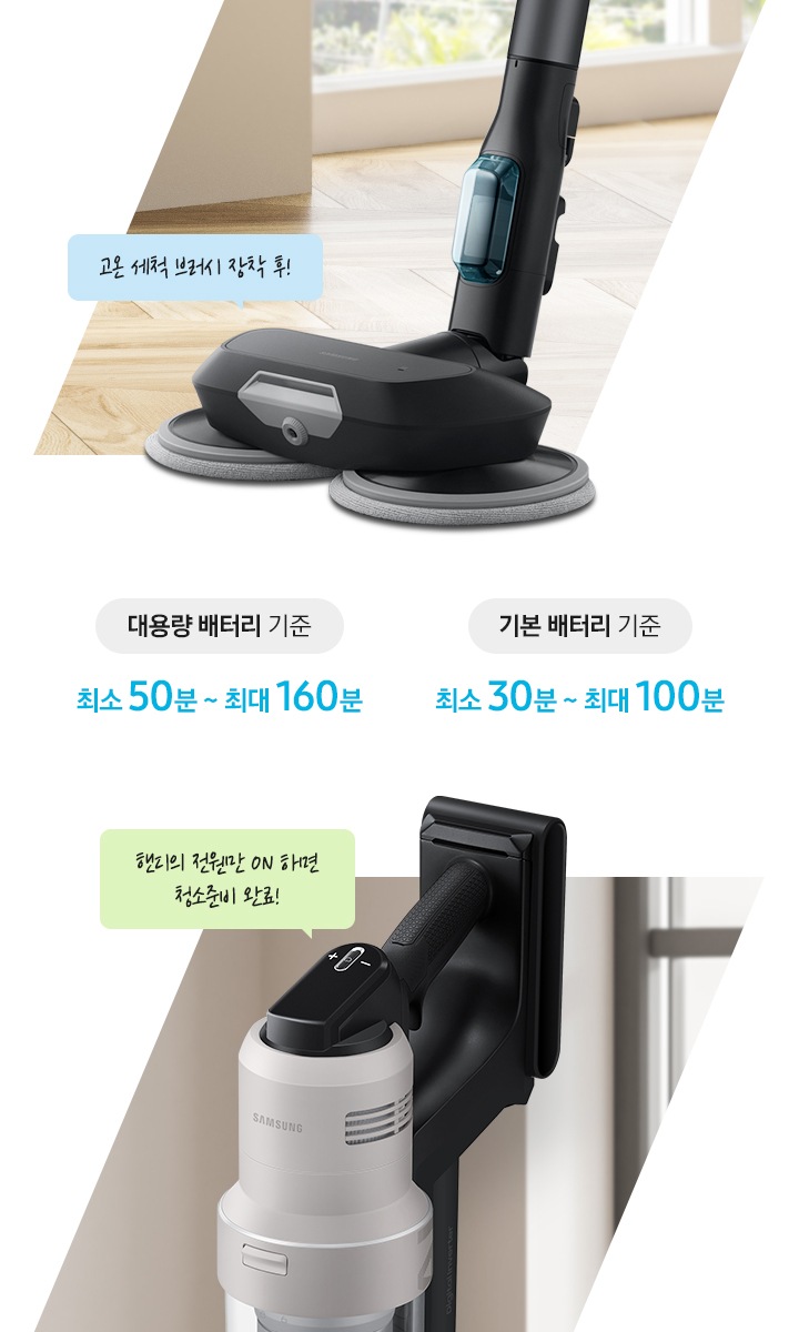 삼성의 모터 기술로 더 강력해진 모터와 배터리를 탑재해 최대 250W의 흡입력을 구현했습니다.