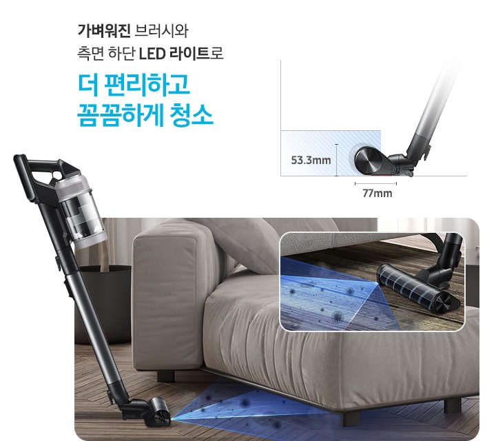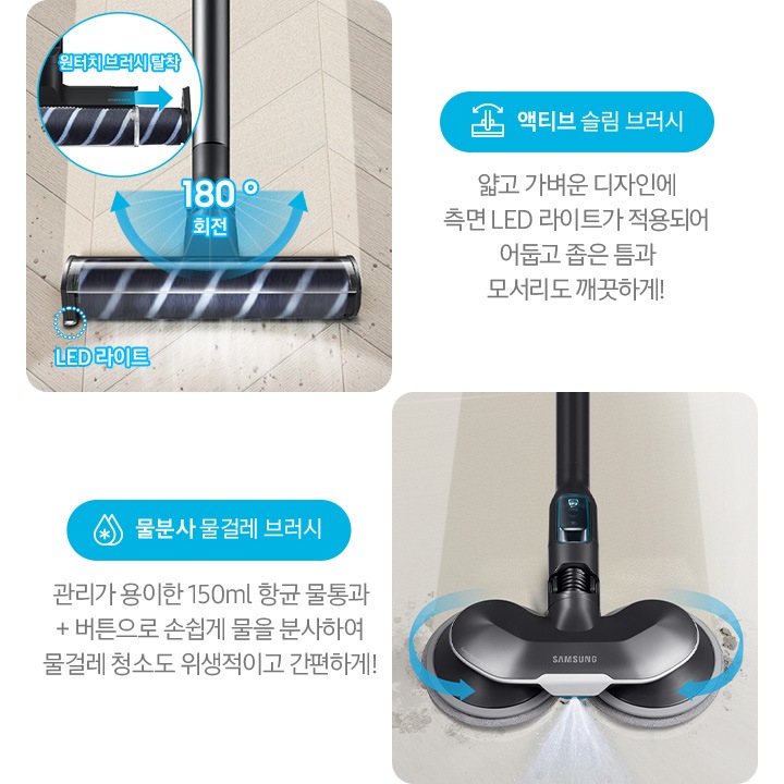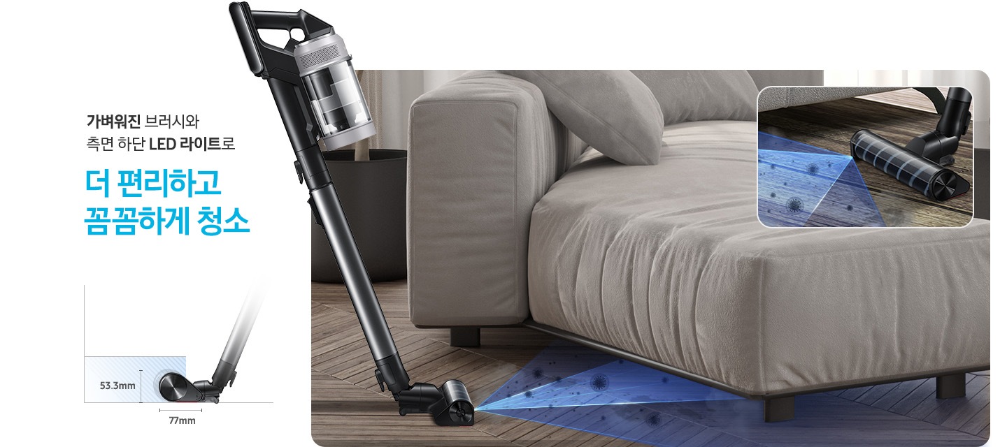 삼성의 특허 출원한 초강력 모터는 한층 더 가벼워졌고, 핸디 무게와 브러시 무게까지 가벼워져 더 편리하게 청소할 수 있죠.