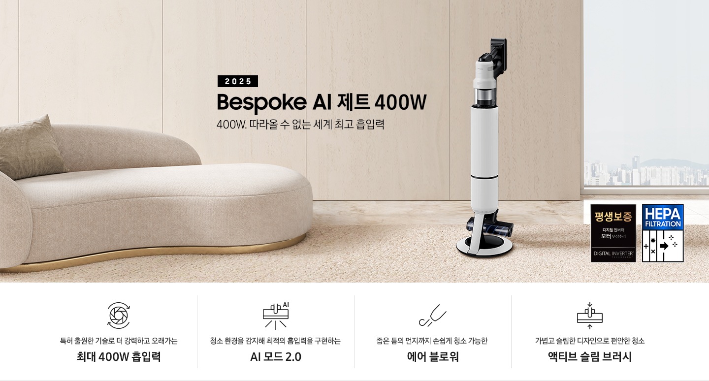 * Bespoke AI 제트 400W : 기존 2024년향 Bespoke AI 제트 최대 흡입력 310W 대비 최대 흡입력 29% 향상