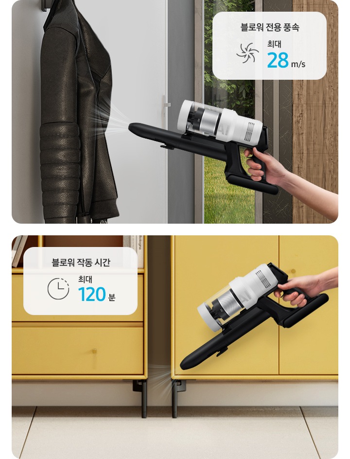 * 흡입력 수치는 국제표준(IEC 62885-4, CL.5.8항)에 따라 핸디형(브러시/연장관/악세서리 미적용)/제트 모드 기준으로
