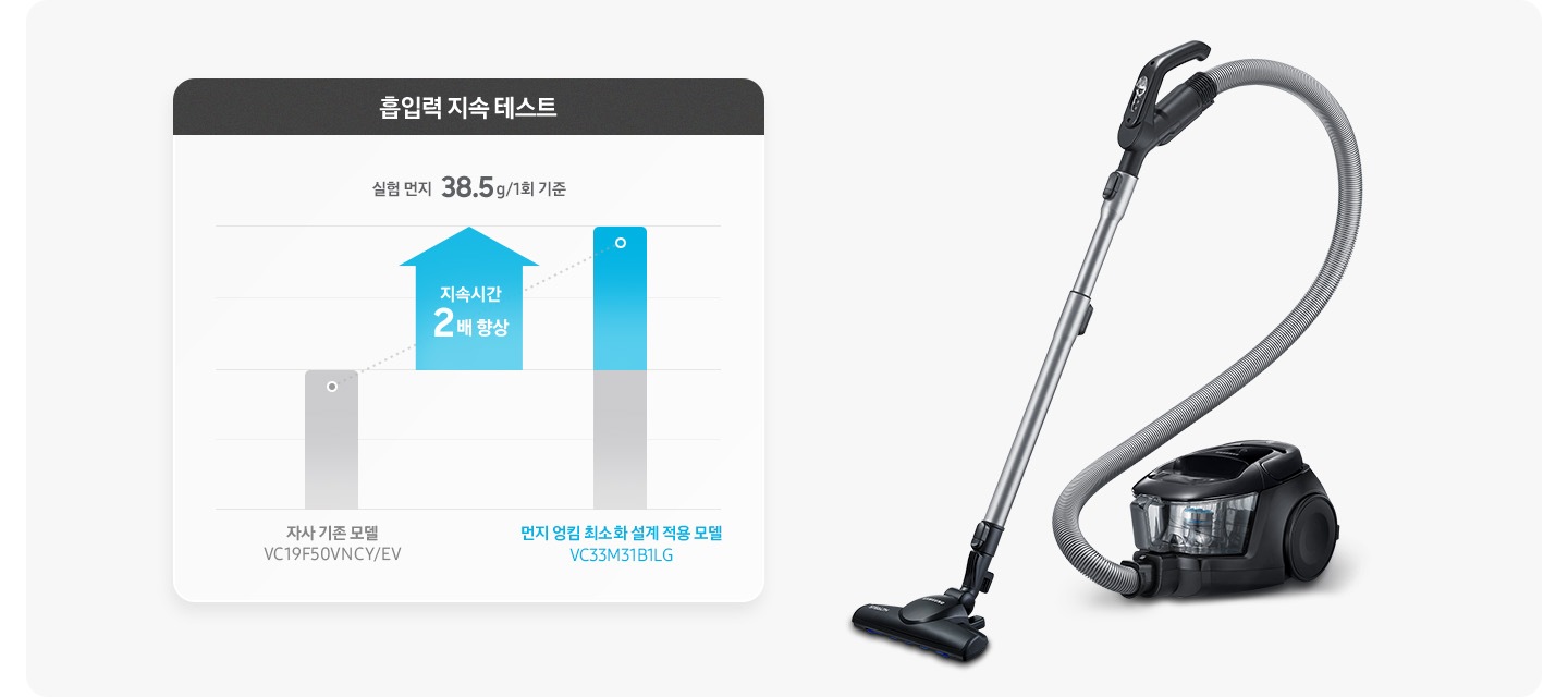 * 실험 먼지 38.5g/1회 기준으로, 필터 막힘 상태가 될 때까지 흡입한 횟수를 비교한 자사 시험치로, 실사용 환경에 따라 다를 수 있습니다.