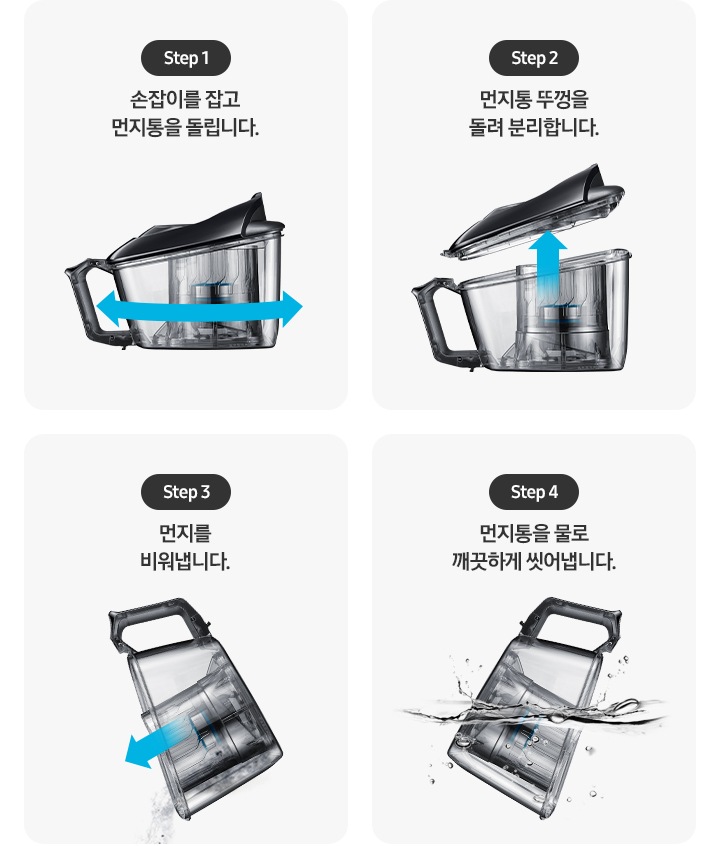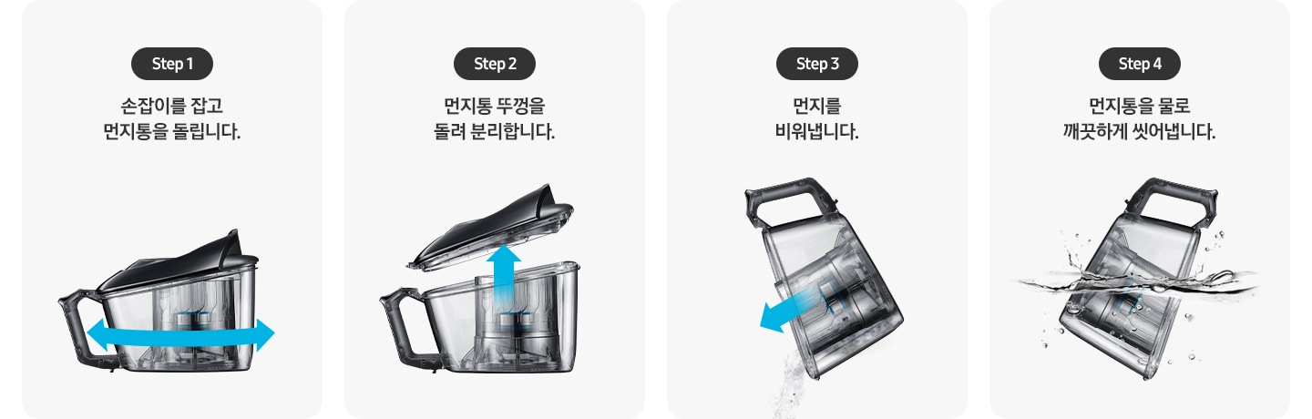파워모션의 먼지통은 본체와 간단히 분리되며 비우기 쉽습니다.