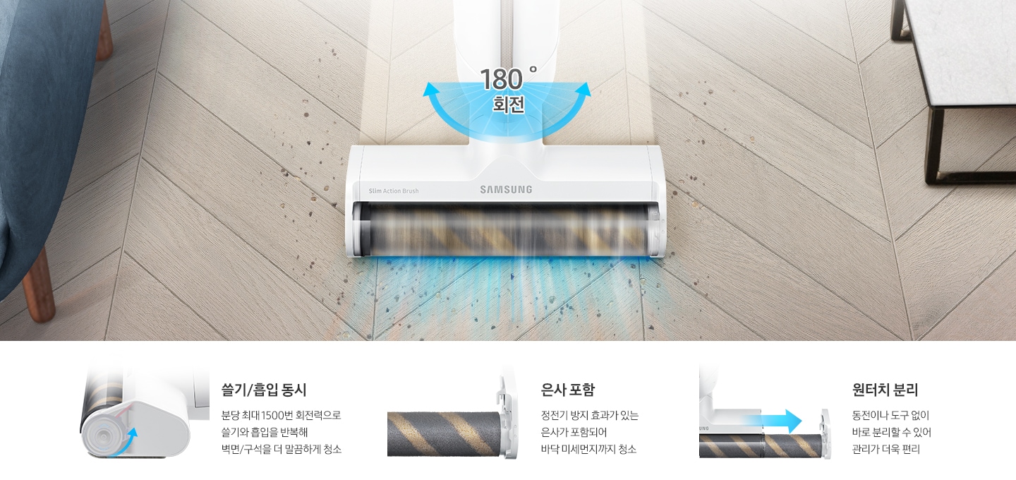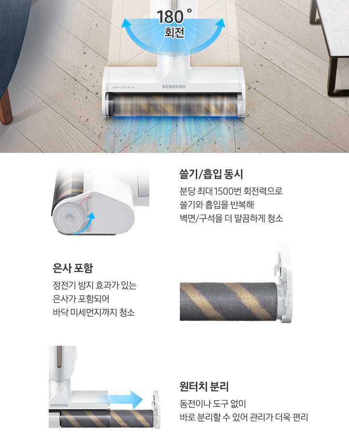 삼성 프리미엄 청소기 비스포크 제트에 적용된 슬림 소프트 마루 브러시가 적용되었습니다. 부드럽게 미세 먼지를 제거해 한국형 바닥에 안성맞춤입니다.
