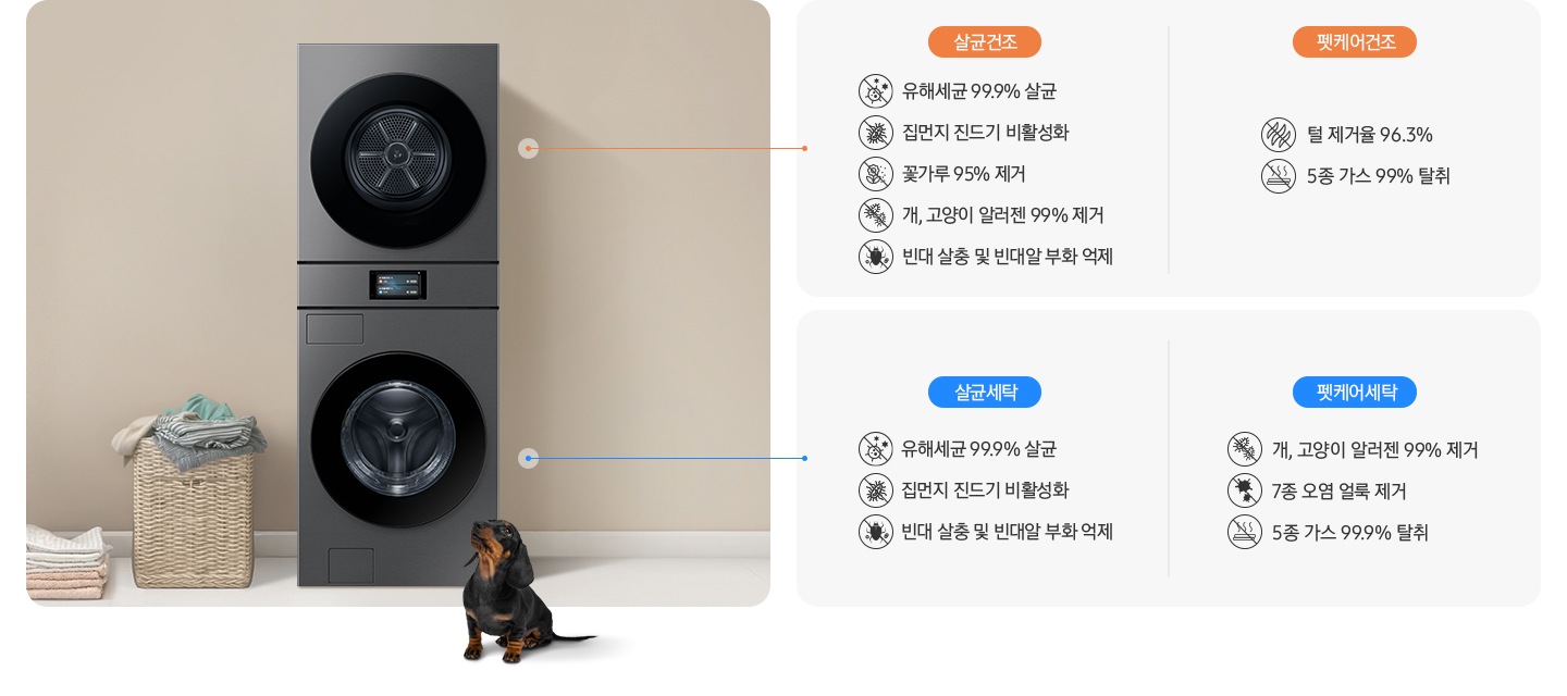 - 펫케어건조 코스 털 제거율 96.3%, 마른 세탁물 1.5kg 부하 기준