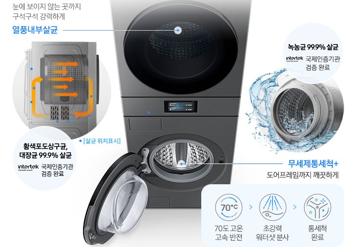 - 젖은 빨래 6kg 기준 황색포도상구균, 녹농균, 대장균을 99.99% 살균