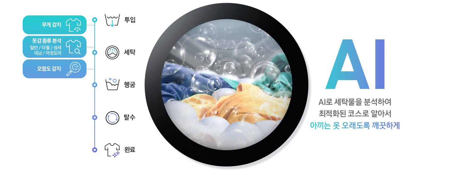 * AI 버블은 AI를 통해 옷감의 종류와 세탁물의 무게, 오염도에 따라 최적의 버블 양으로 깨끗하고 섬세하게 세탁하는 삼성의 세탁 기술입니다.