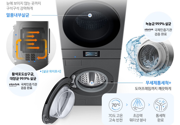 - 젖은 빨래 6kg 기준 황색포도상구균, 녹농균, 대장균을 99.99% 살균