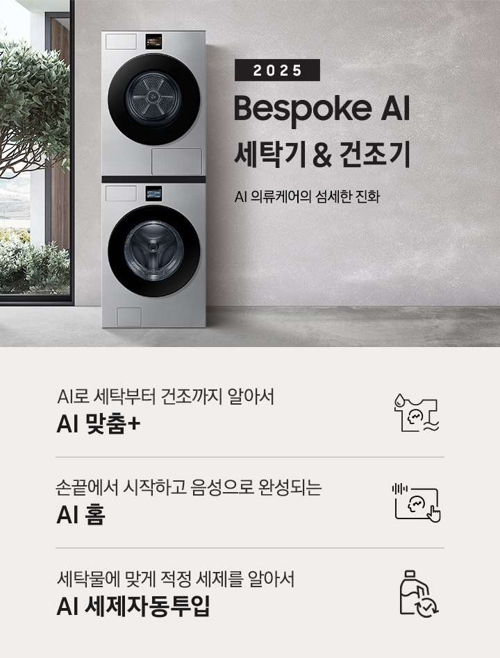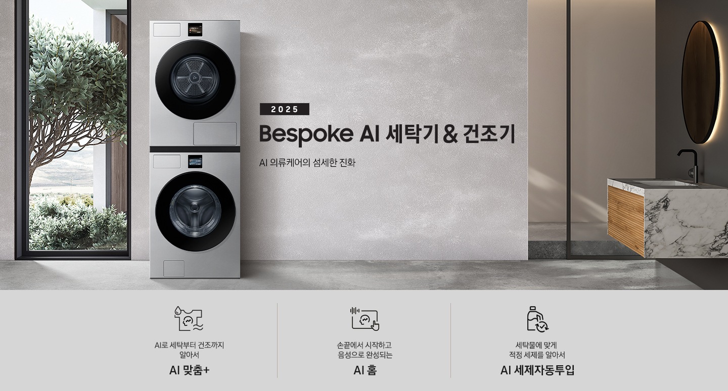 2025 Bespoke AI 세탁기&건조기 인테리어컷입니다. AI 의류케어의 섬세한 진화. 그레이톤 벽면에 세탁기와 건조기가 직렬설치되어 있습니다. 좌측에는 통창 밖으로 나무가 보이고, 우측에는 대리석 벽면이 보이는 연출된 이미지 입니다. 인테리어컷 하단에는 Bespoke AI 세탁기&건조기 패키지 특장점을 설명하는 문구입니다. AI로 세탁부터 건조까지 알아서 AI 맞춤+ 문구와 아이콘, 손끝에서 시작되고 음성으로 완성되는 AI 홈 문구와 아이콘, 세탁물에 맞게 적정 세제를 알아서 AI 세제자동투입 문구와 아이콘이 나와있습니다. 2025 Bespoke AI 세탁기&건조기 인테리어컷입니다. AI 의류케어의 섬세한 진화. 그레이톤 벽면에 세탁기와 건조기가 직렬설치되어 있습니다. 좌측에는 통창 밖으로 나무가 보이고, 우측에는 대리석 벽면이 보이는 연출된 이미지 입니다. 인테리어컷 하단에는 Bespoke AI 세탁기&건조기 패키지 특장점을 설명하는 문구입니다. AI로 세탁부터 건조까지 알아서 AI 맞춤+ 문구와 아이콘, 손끝에서 시작되고 음성으로 완성되는 AI 홈 문구와 아이콘, 세탁물에 맞게 적정 세제를 알아서 AI 세제자동투입 문구와 아이콘이 나와있습니다.