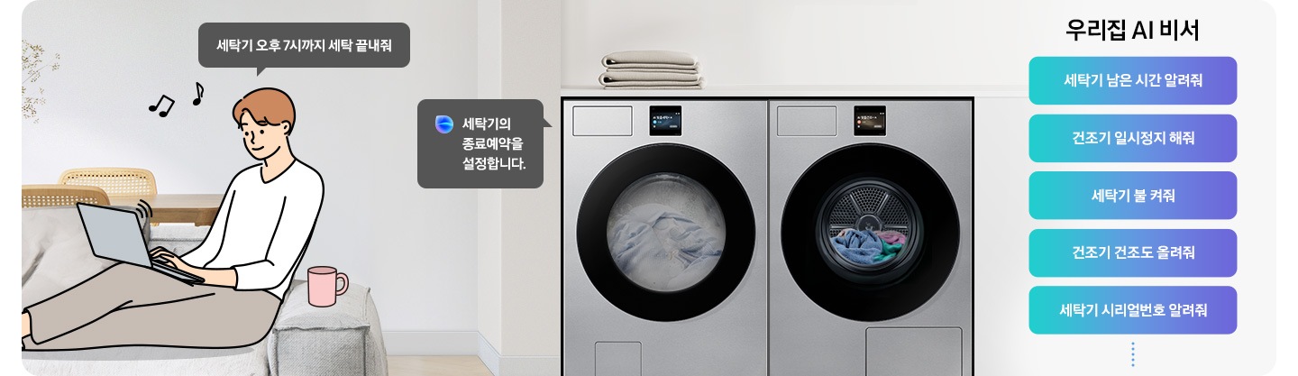 쇼파에 앉아 노트북을 하고 있는 남성이 '세탁기 오후 7시까지 해줘' 라고 말하는 일러스트가 나와있습니다. 우측에 Bespoke AI 세탁기 빅스비 음성인식이 작동하여 '오후 7시로 세탁기 종료 예약을 설정했어요' 라는 문구가 나오고 있습니다. 빅스비 음성인식으로 가능한 문구가 나와있습니다. 우리집 AI 비서-세탁기 남은 시간 알려줘, 건조기 일시정지 해줘, 세탁기 불 켜줘, 건조기 건조 올려줘, 세탁기 시리얼번호 알려줘. 쇼파에 앉아 노트북을 하고 있는 남성이 '세탁기 오후 7시까지 해줘' 라고 말하는 일러스트가 나와있습니다. 우측에 Bespoke AI 세탁기 빅스비 음성인식이 작동하여 '오후 7시로 세탁기 종료 예약을 설정했어요' 라는 문구가 나오고 있습니다. 빅스비 음성인식으로 가능한 문구가 나와있습니다. 우리집 AI 비서-세탁기 남은 시간 알려줘, 건조기 일시정지 해줘, 세탁기 불 켜줘, 건조기 건조 올려줘, 세탁기 시리얼번호 알려줘.