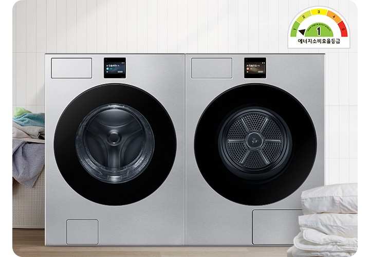 Bespoke AI 세탁기+건조기 25/20kg (109.2mm LCD)+상단 설치 키트 실버스틸 세탁기+건조기 정면