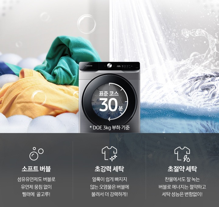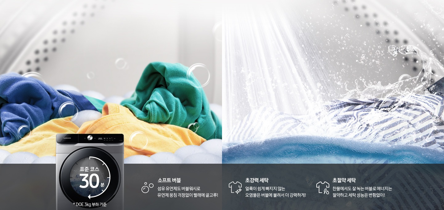 세제를 충분히 녹여 만들어낸 버블워시가 옷감 사이사이 약 2.5배 빠르고 깊숙하게 스며들어 빈틈없이 세탁합니다.