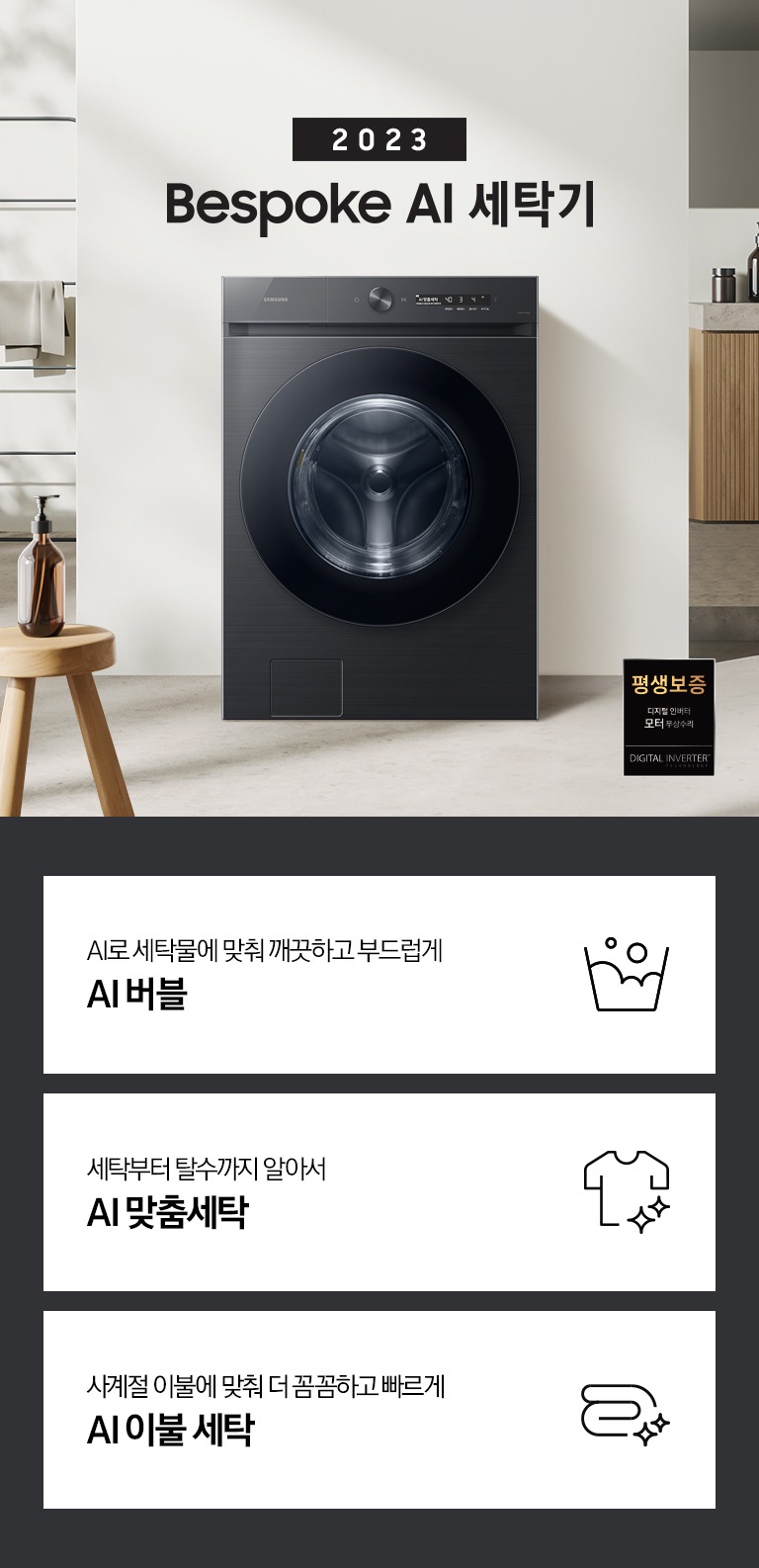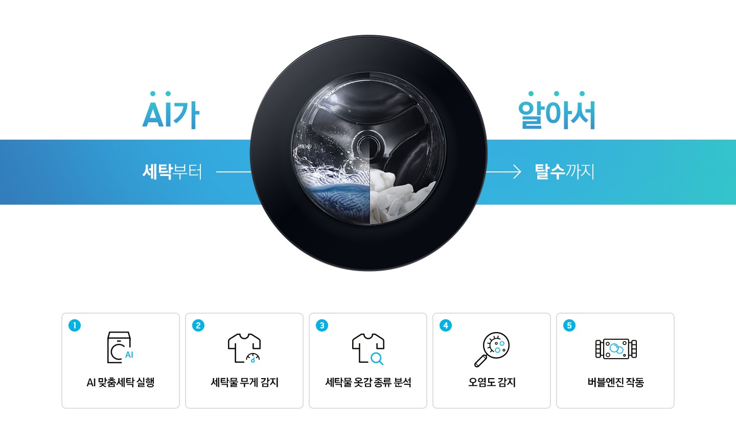 AI가 세탁물에 맞는 워터샷 세기, 버블동작, 세탁/헹굼/탈수까지 조절하여 깨끗하고 섬세하게 세탁합니다.