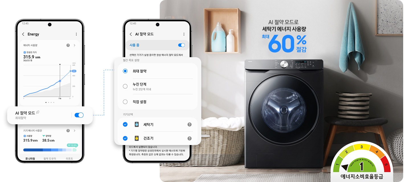 세탁기 에너지 사용량을 최대 60% 줄여줍니다.