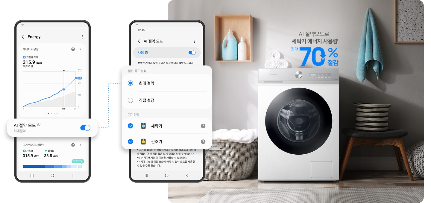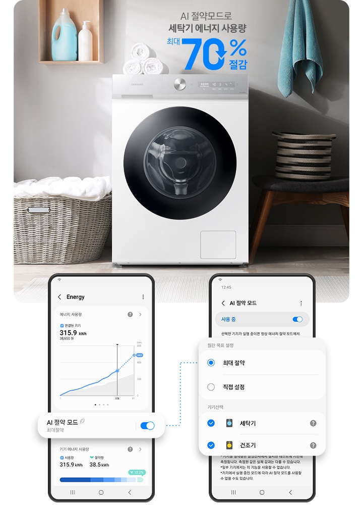 SmartThings를 통해서 AI 절약모드 설정하면 버블워시로 높은 세탁력은 유지하고,