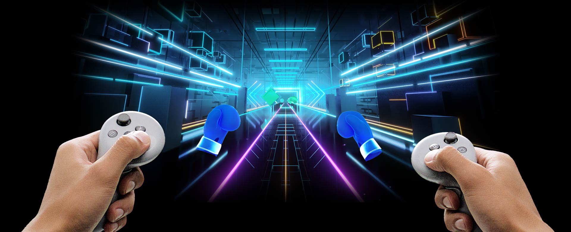 사용자가 갤럭시 XR 컨트롤러를 손에 들고 갤럭시 XR로 게임을 즐기고 있습니다. 사용자는 각 컨트롤러에 해당하는 권투 글러브를 움직여 목표물을 타격하고 파괴합니다.