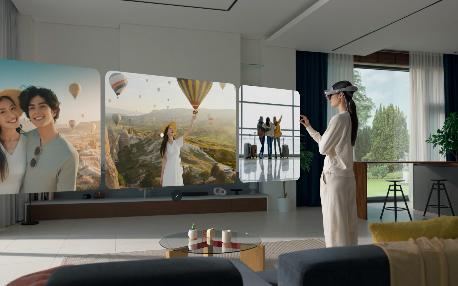 거실에 서 있는 한 여성이 갤럭시 XR을 착용한 채 Google 포토 앱을 열고 손동작으로 여행 사진과 동영상을 스와이프합니다. 여성은 손동작을 이용해 선택한 동영상을 3D 영상으로 변환합니다. 몰입감 넘치는 3D 영상이 광활한 갤럭시 XR 화면에 펼쳐지자, 여성은 거실 소파에서 일어나 영상 속 열기구 중 하나에 손을 뻗어 만지려 합니다. 몰입감 넘치는 갤럭시 XR 화면을 생생하게 즐기는 여성의 뒷모습이 비춰지고,마지막에는 Google 포토 로고가 함께 나타납니다.
