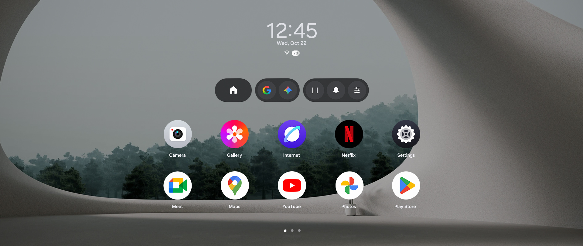 Google Gemini 아이콘이 튀어 오르고, 갤럭시 XR의 런처 화면에 다양한 앱 아이콘과 시간이 맨 위에 표시됩니다.