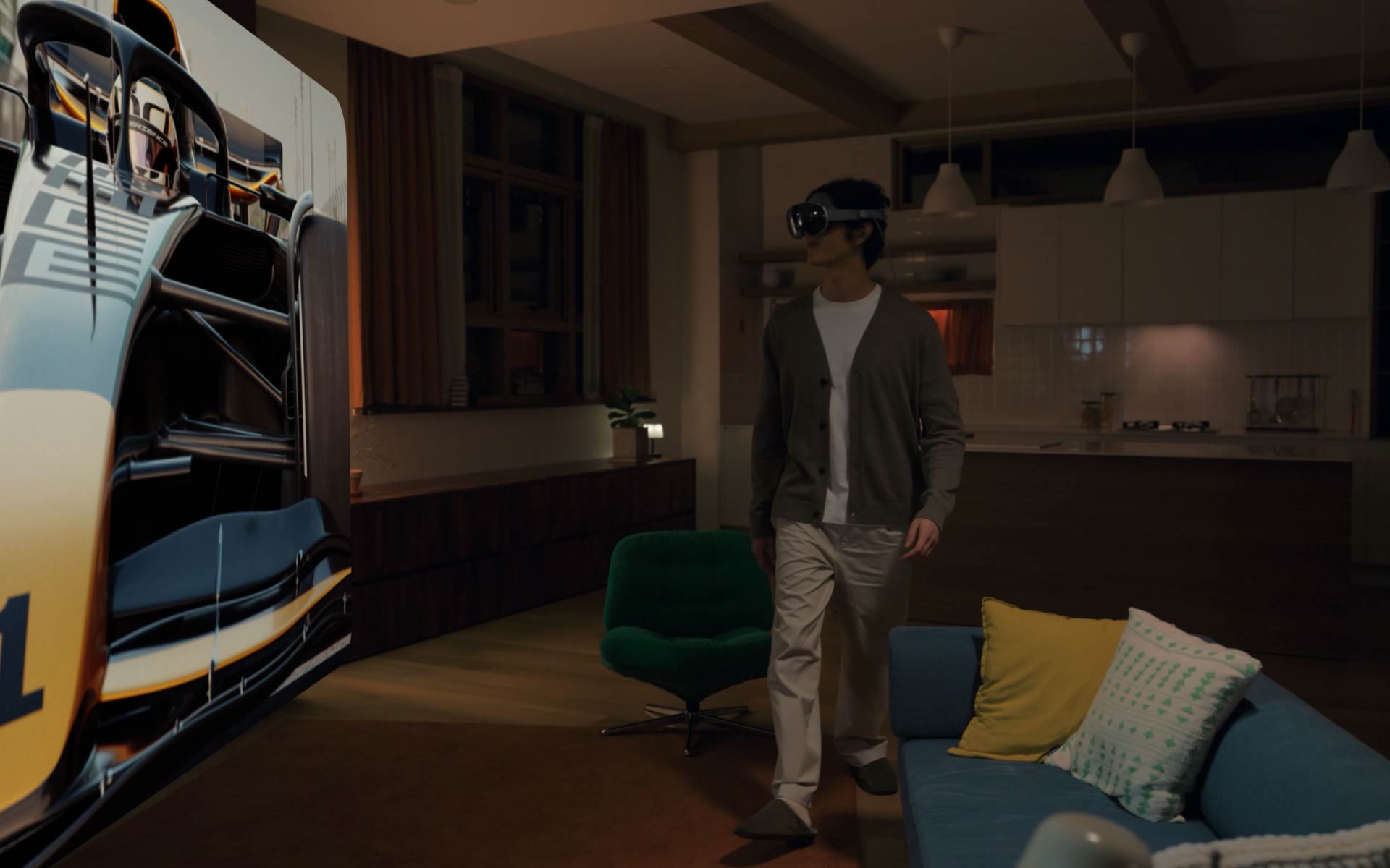 갤럭시 XR을 착용한 한 남성이 거실 소파에 앉아 갤럭시 XR의 광활한 화면으로 F1 레이싱 대회를 즐기고 있습니다. 소파 위에 앉아 갤럭시 XR 화면 속에 고속으로 달리는 F1 자동차를 응시하는 남성의 뒷모습입니다. 갤럭시 XR을 착용한 남성이 극도의 현실감에 몰입한 모습을 클로즈업합니다. 남성은 이제 갤럭시 XR을 착용하고 거실에 서서 갤럭시 XR 컨트롤러를 사용해 가상의 상대와 테니스 경기를 하고 있습니다. 테니스 라켓의 움직임은 컨트롤러의 움직임과 일치합니다.