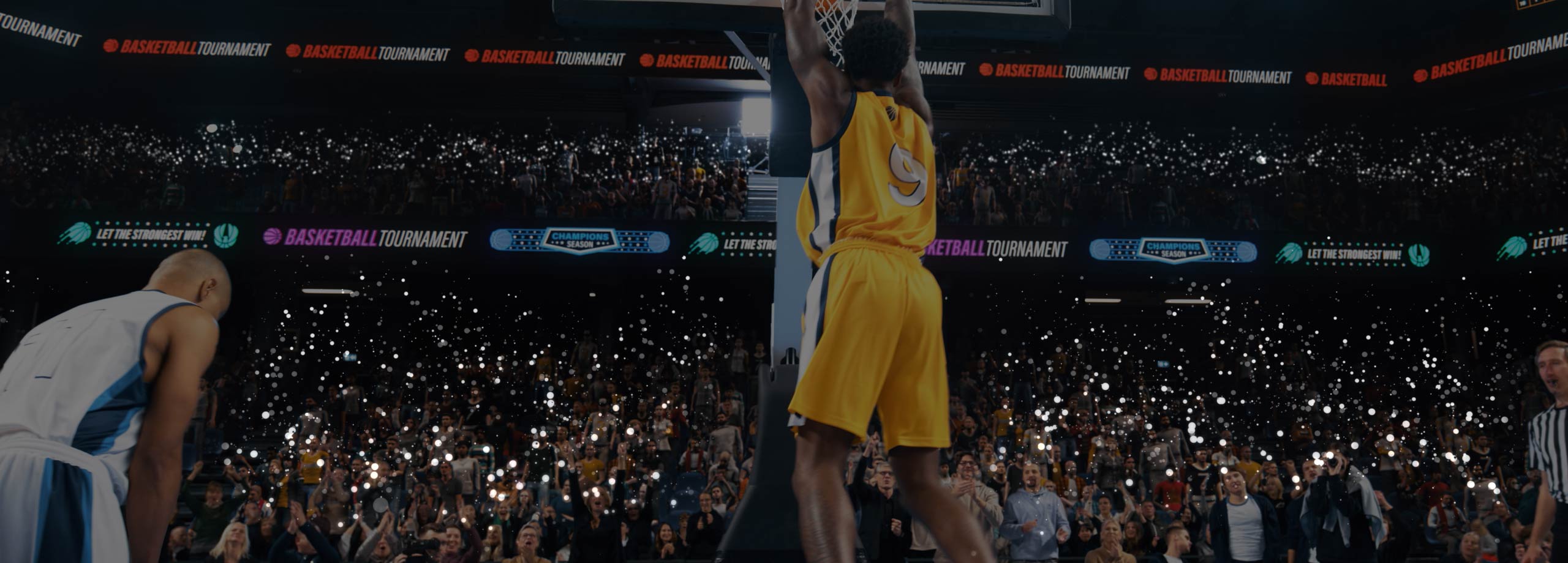 전원이 켜진 갤럭시 XR의 렌즈와 디스플레이가 있습니다. 사용자의 시야가 렌즈를 통과하면, 디스플레이는 관중으로 가득찬 경기장에서 펼쳐지는 몰입감 있는 농구 경기를 드러냅니다. 화면 전체에 퍼지는 음파와 함께 기기의 실감나는 고해상도 비주얼과 3D 사운드를 강조합니다.