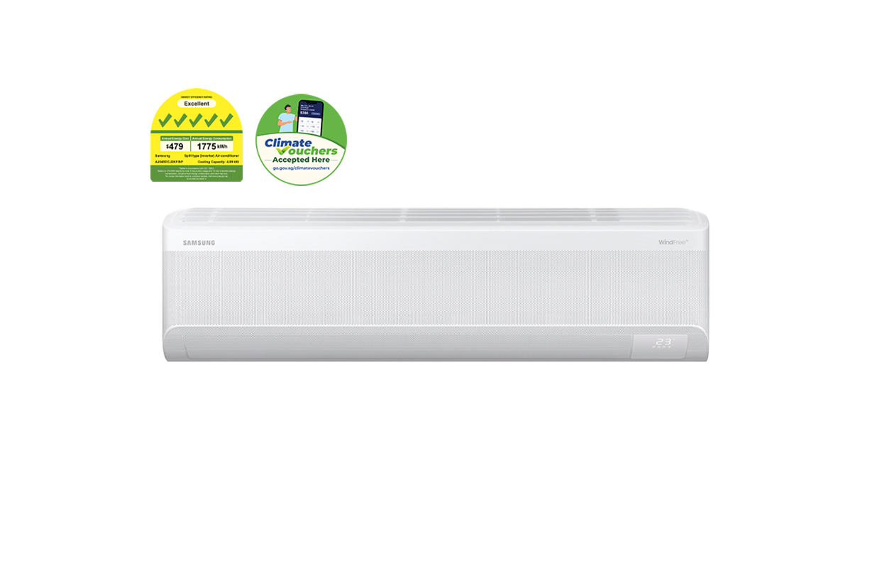 - *Based on internal testing. Tested on the AR12TXCAAWKEU model compared with the Samsung conventional AQ12EASER model, measuring the time taken to reduce the room temperature from 33°C to 25°C. **Based on internal testing. Tested on the AR12TXCAAWKNEU model. WindFree™ mode generates only 23dB of noise, compared to 26dB with the Samsung conventional model.