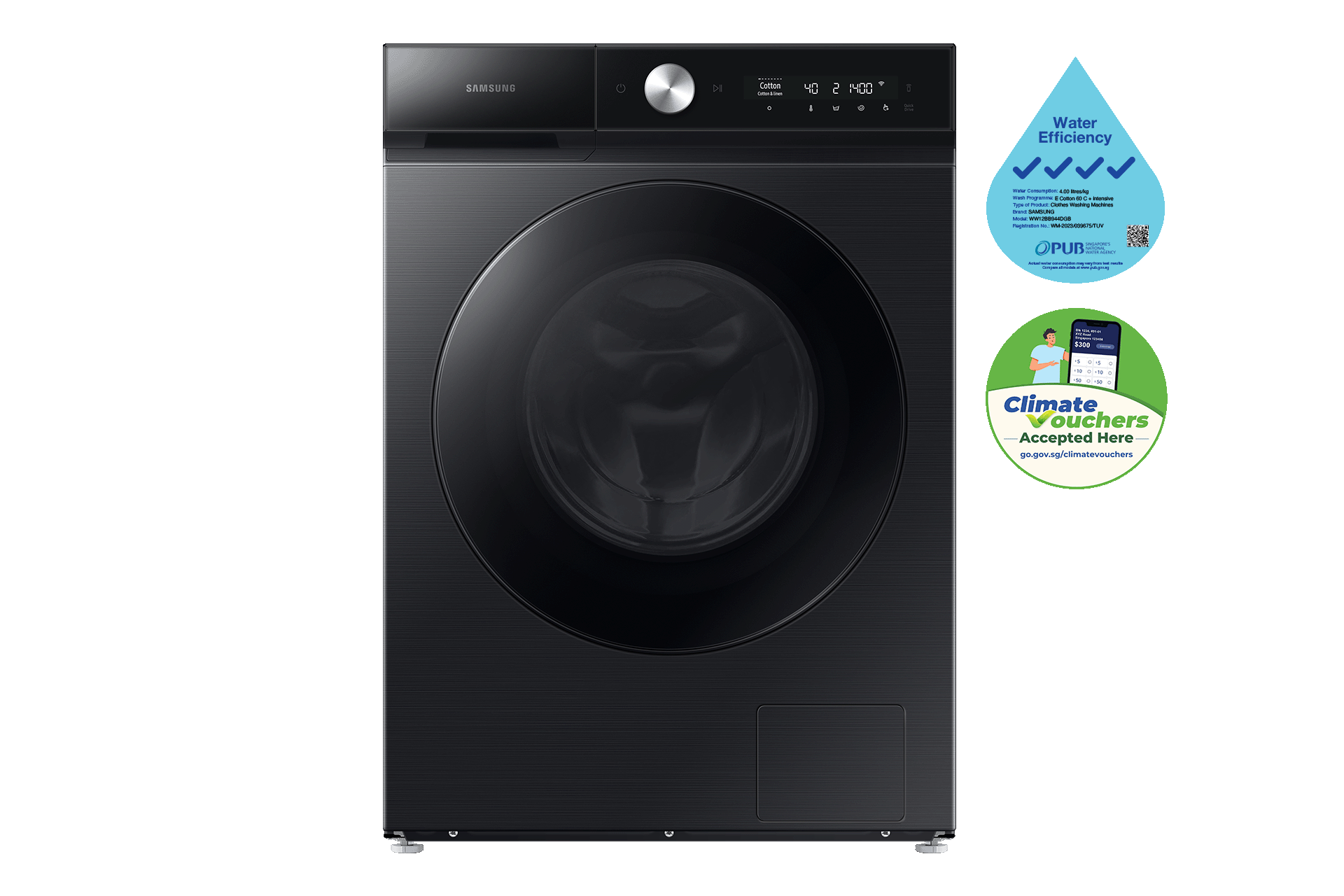 *AI Ecobubble is only activated when specific courses are selected, including Cotton, Synthetics and AI Wash with loads less than 2kg. **Based on Performance Lab Test report by Springboard Engineering on EMPA strips, comparing a normal detergent solution and bubble technology without mechanical action. Individual results may vary. ***Tested in accordance with IEC 60456-2010/4kg Wash Load/Super Eco Wash cold (WF80F5E5U4W) vs. Cotton 40°C without Ecobubble (WF0702WKU). Individual results may vary. ****Based on EMPA test of 9kg model (WF906U4SAGD, Synthetics), with or without Bubble. Individual results may vary.