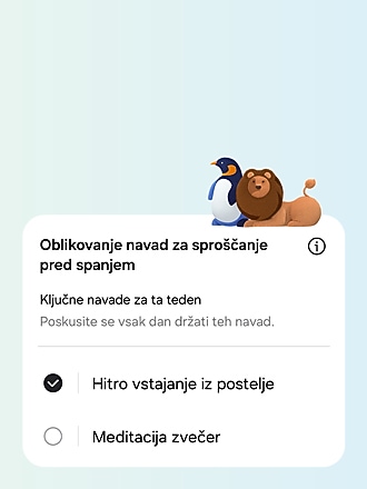 Kaj je svetovanje za spanje?Svetovanje za spanje je funkcija, ki ponuja prilagojen program treniranja spanja na podlagi vaših podatkov o spanju. Nosite svojo Galaxy Watch ali Ring vsaj 7 dni med spanjem, vključno z vsaj enim delovnim dnem in enim prostim dnem. Ko bo zbranih dovolj podatkov, vam bo dodeljena žival za spanje in program se bo začel.