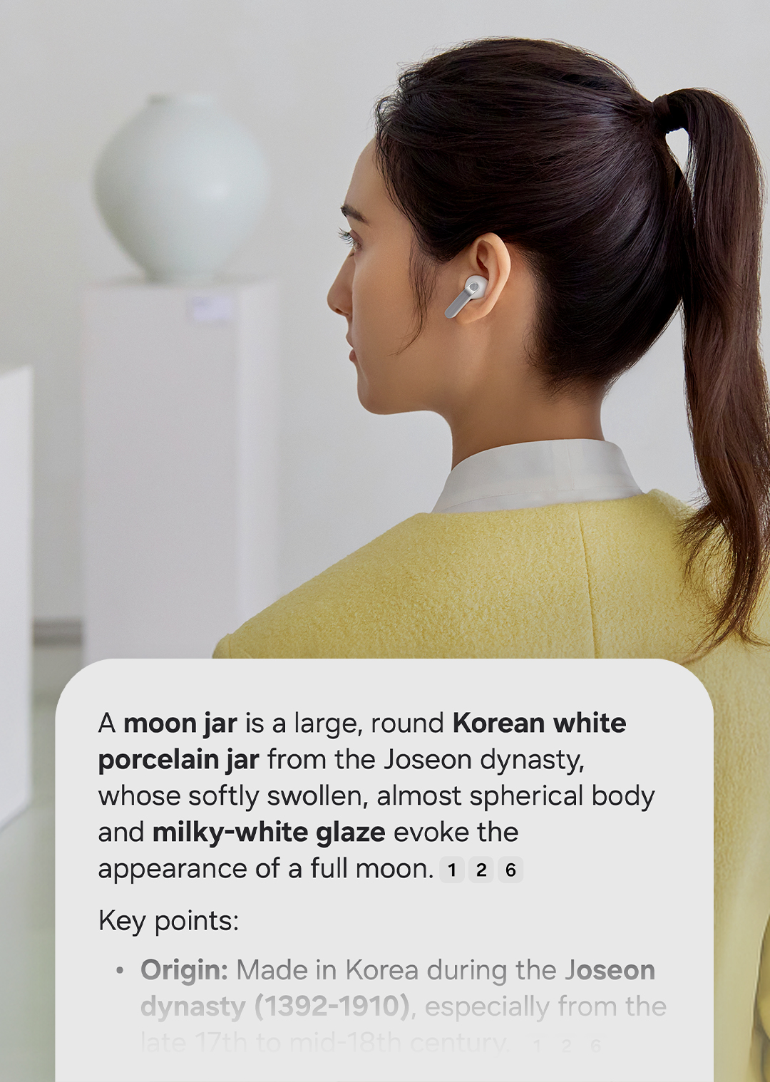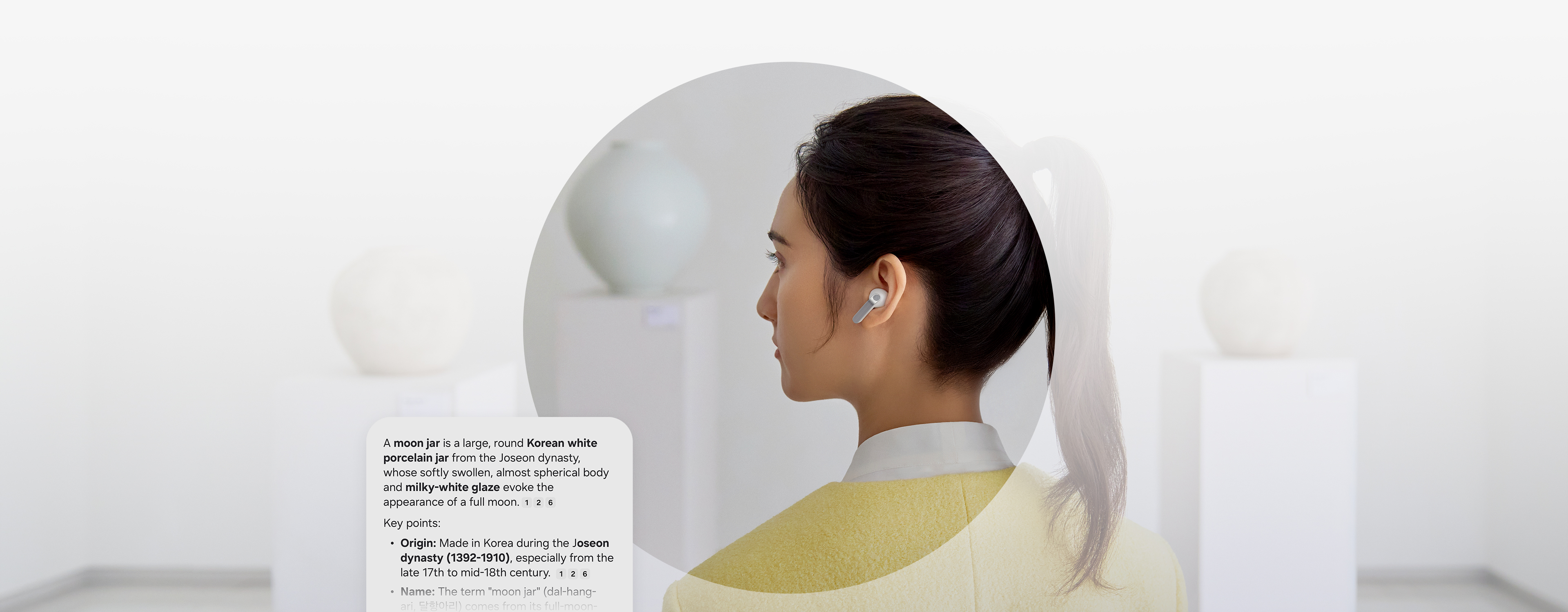 Pogled od zadaj na žensko, ki uporablja eno belo Galaxy Buds4 Pro brezžično slušalko. V bližini je besedilni oblaček z vprašanjem za AI »Kaj je lunasti vrč?«. Pod tem oblačkom je ločen oblaček z odgovorom: »Lunasti vrč je velik, okrogel, bel korejski porcelanasti vrč iz obdobja dinastije Joseon, katerega mehko izbočeno, skoraj kroglasto telo in mlečno bela glazura spominjata na videz polne lune.« V nadaljevanju je seznam glavnih značilnosti lunastega vrča.