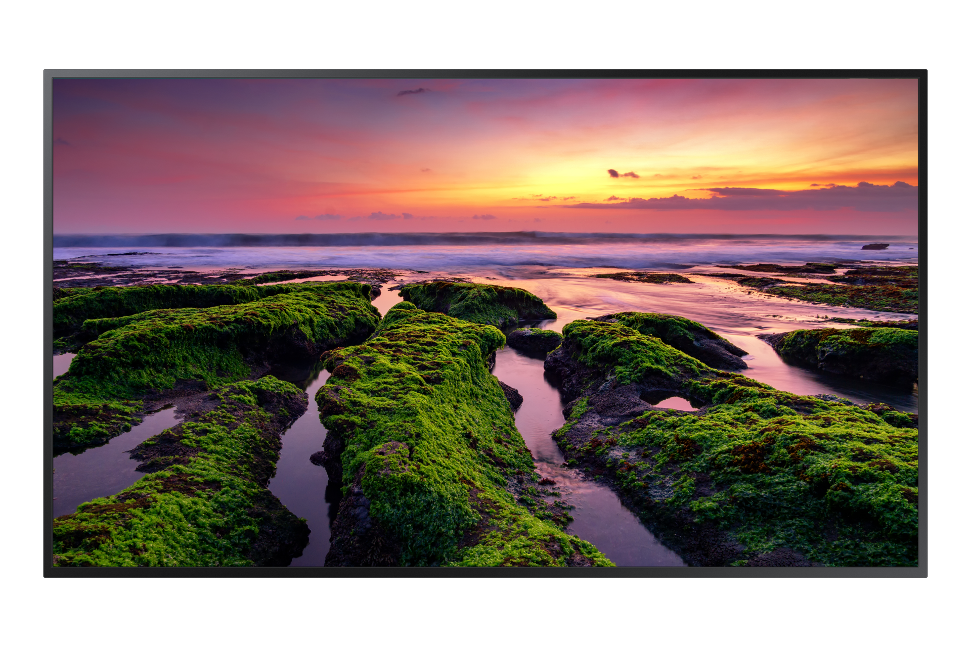 Tanki okvirji in simetrična oblika omogočajo brezhibno integracijo v vsako okolje s poenostavljeno montažo in namestitvijo. Vsi priključki so obrnjeni navzven, kar prihrani veliko prostora in zagotavlja, da zaslon visi poravnano s katerokoli steno.