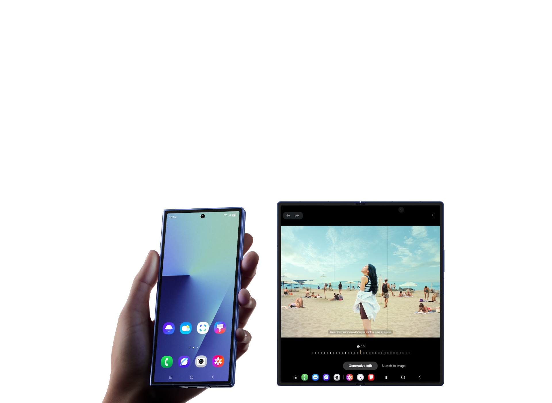 Galaxy Z Fold7 vam omogoča, da v celoti izkoristite njegov obsežni glavni zaslon za izboljšano večopravilnost z orodji umetne inteligence, kot sta pomoč pri pisanju in pomoč pri prepisovanju, kar vam omogoča, da hkrati opravljate več nalog. Idealen je tudi za funkcije urejanja fotografij z umetno inteligenco, kot je generativno urejanje, saj vam daje dovolj prostora za primerjavo originalne in urejene različice.
