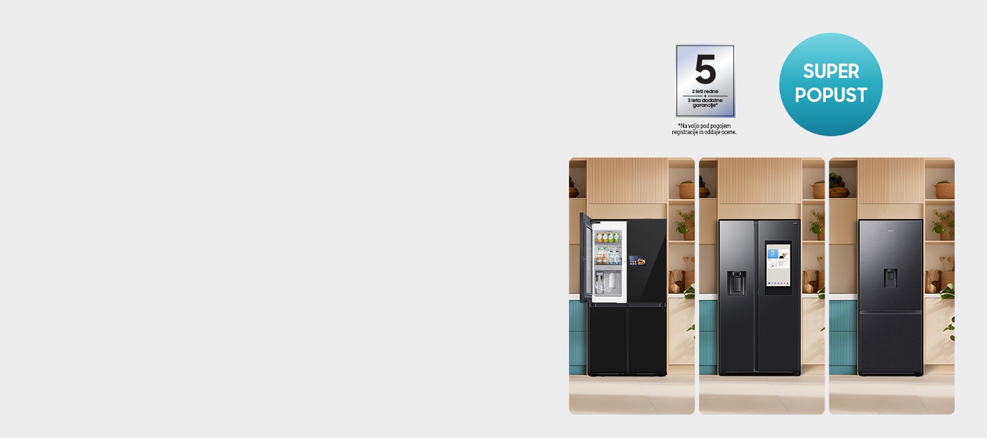 Izkoristite to super priložnost za osvežitev svojega doma s superiornim hladilnikom Samsung in nikakor ne zamudite možnosti za pridobitev dodatnih 3 let garancije za izbrane hladilnike v promociji, ki velja med 13. januarjem in 31. decembrom 2025. Dodatna garancija je na voljo pod pogojem, da oddate oceno izdelka in opravite registracijo na samsungpodaljsanagarancija.si najkasneje v 30 dneh od nakupa aparata. Za več informacij obiščite www.samsung.com/si/offer/home-appliance-extended-warranty-2025.