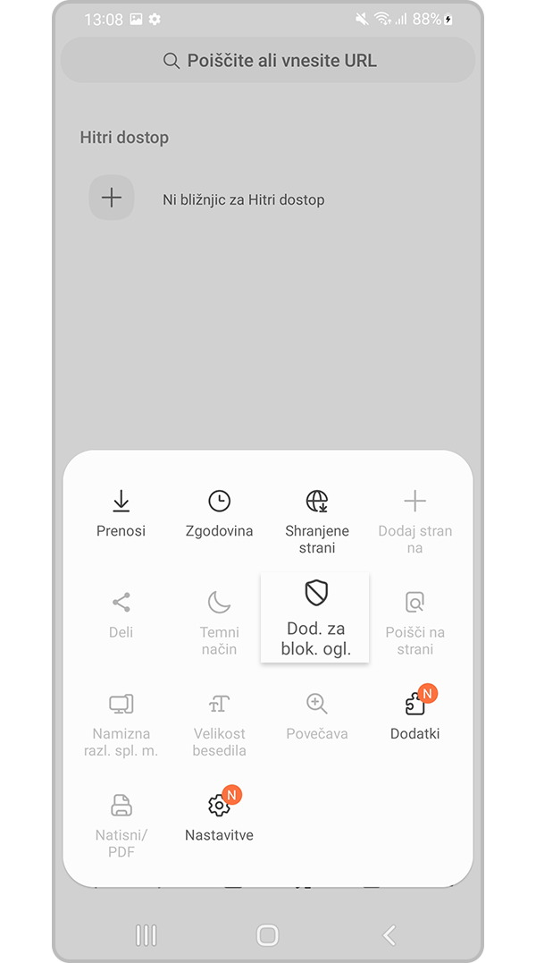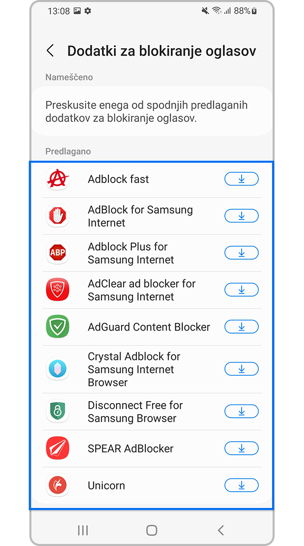 Tudi če z napravo obiskujete varna spletna mesta, ste lahko izpostavljeni škodljivim oglasom. Zaradi nevarnosti okužbe z zlonamerno programsko opremo prek škodljivih oglasov priporočamo uporabo funkcije Blokiranje oglasov v aplikaciji Samsung Internet, da omejite pojavna okna in zaščitite svojo napravo.