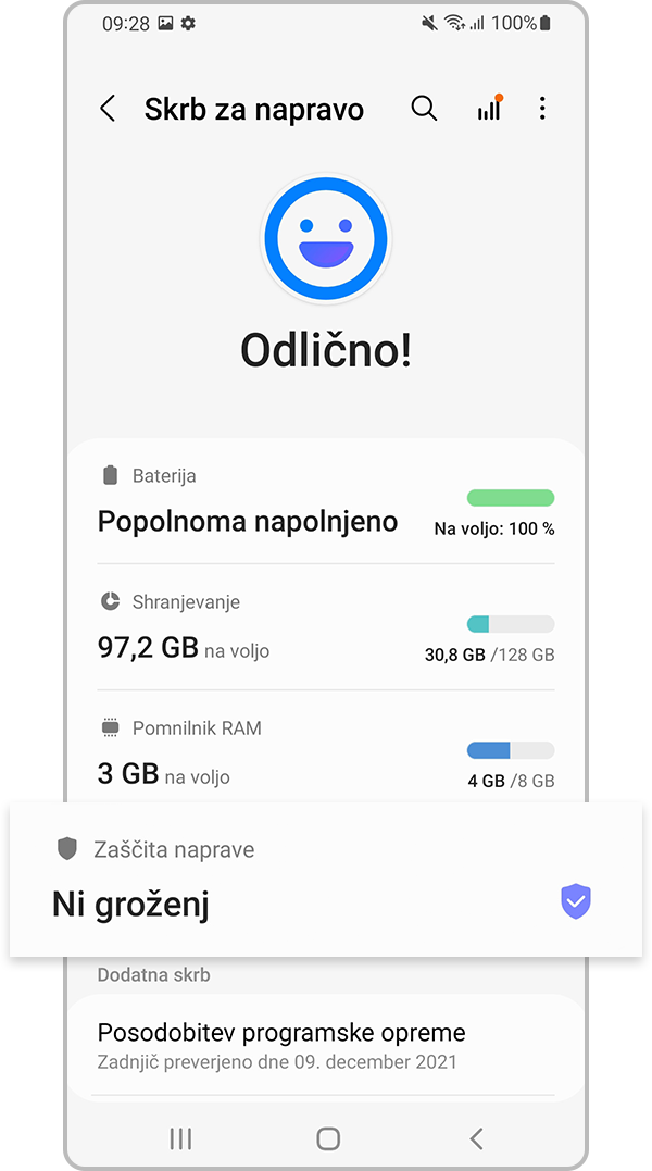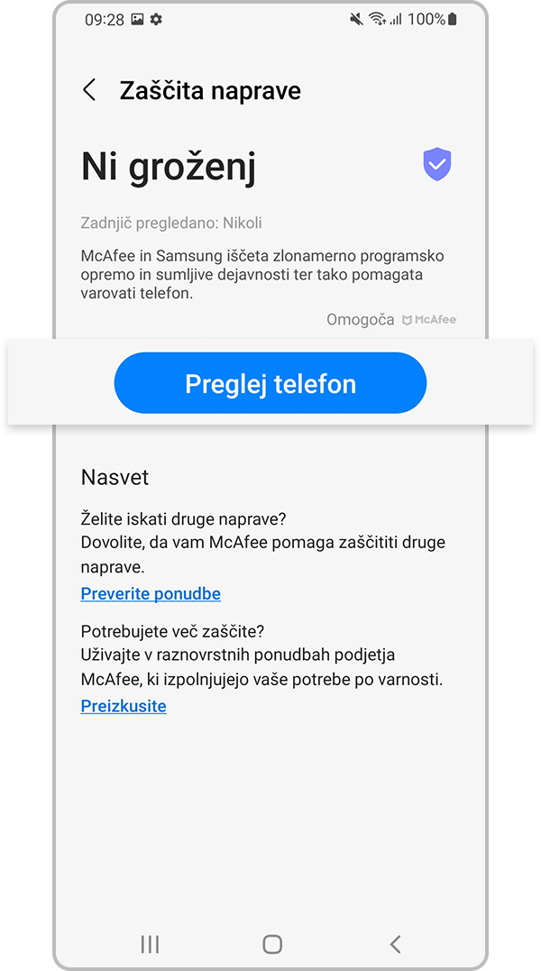 Ker naprave Galaxy pred prenosom pregledajo aplikacije iz trgovine Play Store in iščejo zlonamerno programsko opremo, je verjetnost, da bi bila naprava okužena z zlonamerno programsko opremo, majhna. Vendar se lahko zlonamerna programska oprema kljub temu namesti v napravo prek oglasov ali e-sporočil. Sledite spodnjemu vodniku, da okrepite zaščito svoje naprave.