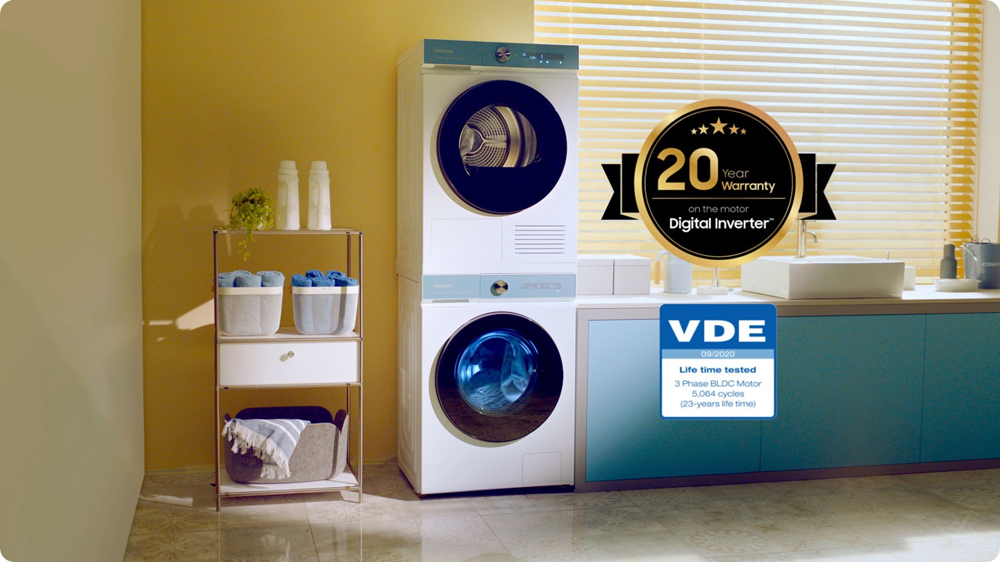 Izkoristite vrhunsko učinkovitost, tišje in dolgotrajno delovanje. Tehnologija z digitalnim inverterjem za tišje⁸ in močnejše delovanje uporablja močne magnete, vendar porabi manj energije kot univerzalni motorji. Zagotavlja tudi najdaljšo vzdržljivost v industriji⁹ in 20-letno garancijo¹⁰ na motor.
