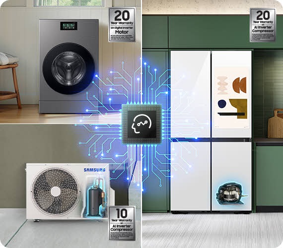- (REF) Na základe interného testovania v porovnaní s bežnými kompresormi Samsung F9. K dispozícii len na produktoch s modelom strojového učenia vybavených algoritmami AI a režim AI Energy musí byť zapnutý v aplikácii SmartThings dostupnej na zariadeniach so systémom Android a iOS. Vyžaduje sa pripojenie Wi-Fi a účet Samsung. Od mája 2024 je AI Compressor aplikovaný na projekt RF9000C/RF9000D/RS8000DC/RS5000DC/RB6000D/BRB6500D/RT6300D/RT6500D. Uplatniteľné modely sa môžu líšiť. miera úspory energie na základe algoritmu AI je 7-11 % a líši sa podľa modelu. Záruka 20 rokov je obmedzená na kompresor (k dispozícii celosvetovo bez Severnej Ameriky).