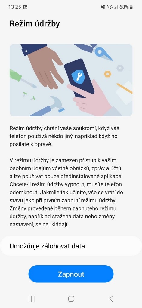 Režim údržby je určený pre situácie, kedy odovzdávate váš telefón na opravu a chcete zabezpečiť súkromie vašich osobných dát.
