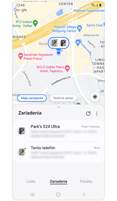 Od. Karta Ľudia poskytuje funkciu zdieľania polohy s rodinou a priateľmi (ľuďmi) na základe vášho konta Samsung. Percentuálny stav batérie a ďalšie informácie môžete nájsť na karte Zariadenia.